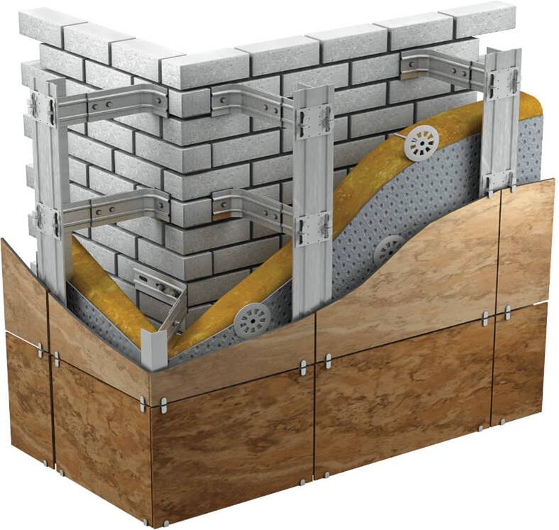 Вентилируемый фасад - это система, состоящая из облицовочных материалов, которые крепятся на стальной оцинкованный или алюминиевый каркас к несущему слою стены или к монолитному перекрытию. По зазору между облицовкой и стеной свободно циркулирует воздух, который убирает конденсат и влагу с конструкций.