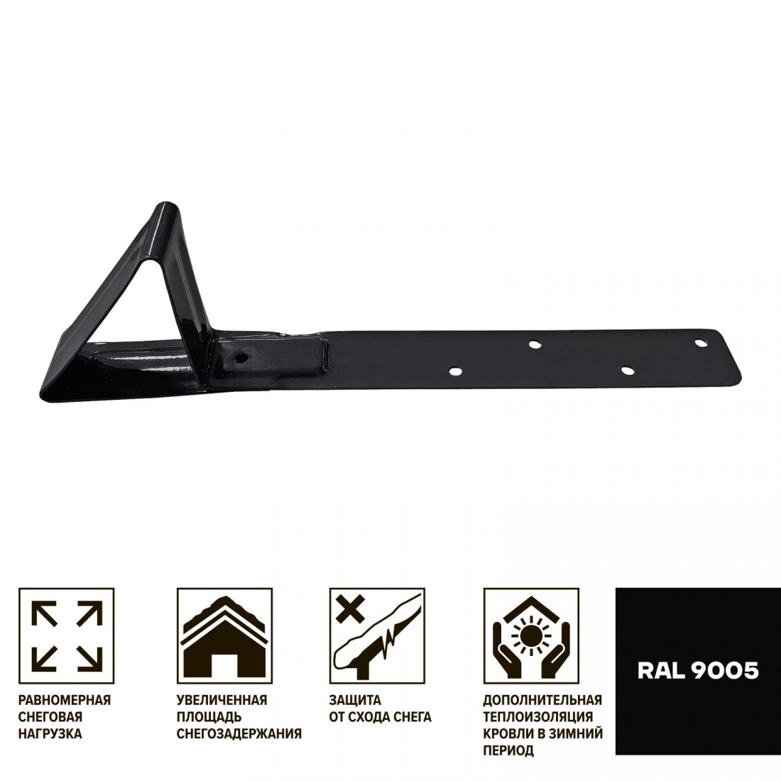 Снегозадержатель усиленный для гибкой черепицы Технониколь Ral 9005 черный, шт купить в Новом Уренгое по оптовой цене в интернет магазине СтройПлатформа. Снегозадержатель усиленный для гибкой черепицы представляет собой металлический уголок с цветным полимерным покрытием на удлиненной ножке, который устанавливается непосредственно в процессе укладки кровельного покрытия. Этот элемент эффективно препятствует лавинообразному сходу снега, защищая водосточную систему и обеспечивая равномерную нагрузку на кровлю.