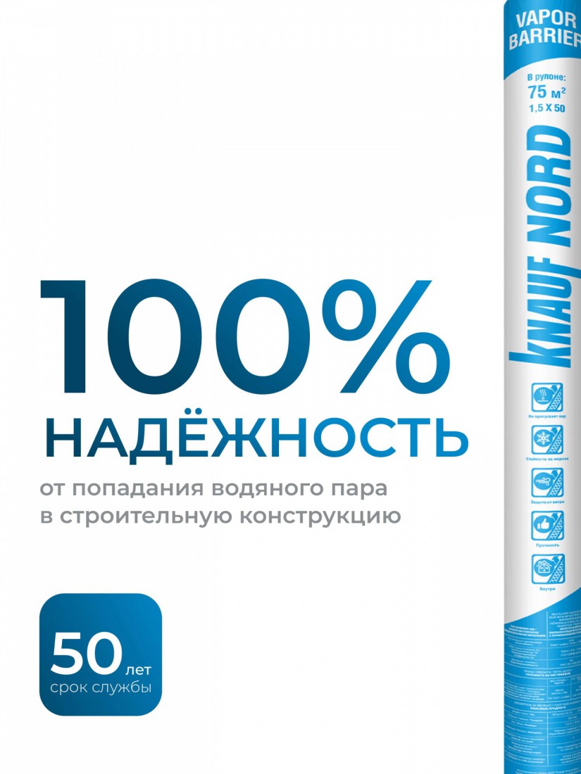 KNAUF NORD Vapor Barrier – это четырехслойный пароизоляционный фольгированный материал, обладающий практически нулевой паропроницаемостью, за счет чего обеспечивает надежную защиту от проникновения водяного пара в строительную конструкцию. Высокопрочный, армированный сеткой, но при этом пластичный даже при отрицательных температурах. Пленка является энергоэффективной за счет наличия алюминиевого рефлексного слоя, что позволяет снижать затраты на отопление и кондиционирование.