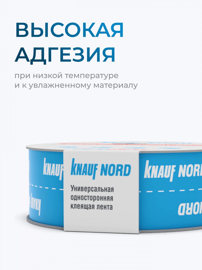 Лента KNAUF NORD обеспечивает надежную защиту от влаги и пара, обладает высокой адгезией и превосходной начальной липкостью благодаря акриловой основе. Её можно использовать при температуре до -10°С и на влажных поверхностях, что делает ленту универсальной в различных условиях. Она легко приклеивается к дереву, бетону, стеклу, металлу и пластику, а также устойчива к воздействию УФ-лучей и влаги, с температурой эксплуатации от +80°С до -50°С.