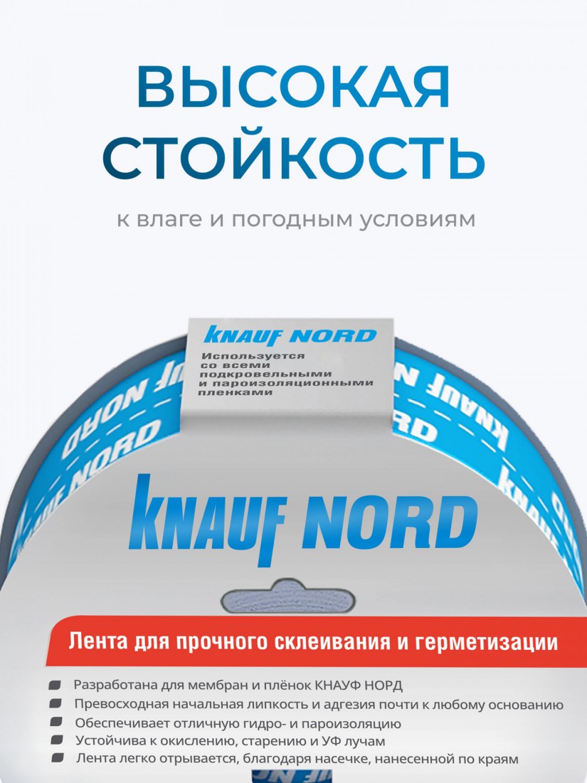 Клейкая лента KNAUF NORD легко монтируется даже при температуре от +10°С и идеально подходит для применения в любых климатических зонах. Её повышенная стойкость к воде, атмосферным воздействиям и ультрафиолетовому излучению гарантирует долговечность и стабильность характеристик. Вырубка краев ленты упрощает процесс монтажа, делая его более удобным и эффективным.