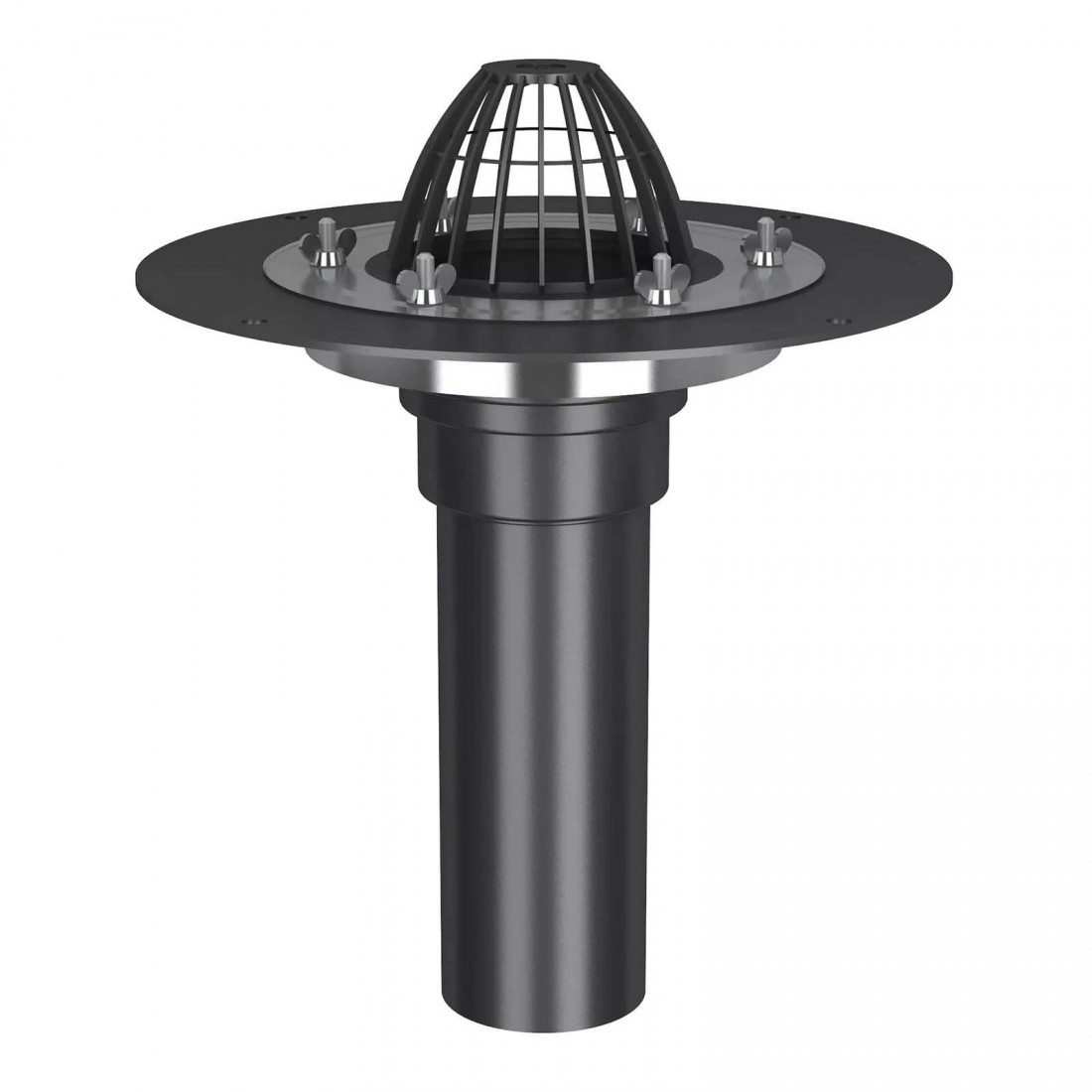 Кровельная воронка предназначена для внутренних водостоков на плоских крышах и совместима со всеми видами кровельных материалов. Обжимной металлический фланец надёжно фиксирует покрытие с помощью гаек и барашков, исключая протечки.