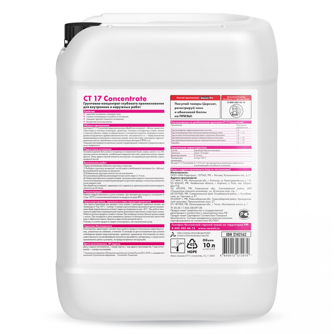 Грунтовка Церезит CT 17 Concentrate глубокого проникновения, концентрат, 10 л, шт купить в Новом Уренгое по оптовой цене в интернет магазине СтройПлатформа. Грунтовка Ceresit CT 17 предназначена для подготовки поверхности перед устройством керамических облицовок, укладкой выравнивающих масс для пола, креплением теплоизоляционных плит, покраской и т.д. с целью укрепления и снижения впитывающей способности основания.