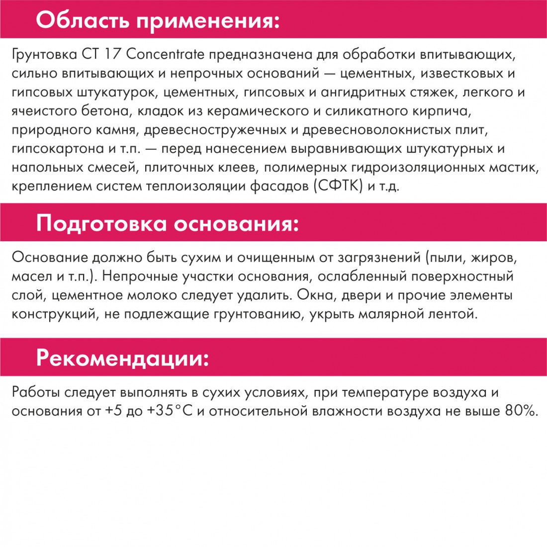 Ceresit CT 17 применяется на таких типичных основаниях как различного рода штукатурные покрытия, бетон, цементно-песчаные стяжки. Грунтовка пригодна для обработки плотного, гладкого бетона, а также существующих керамических или каменных облицовок.