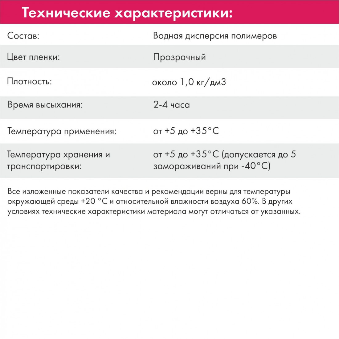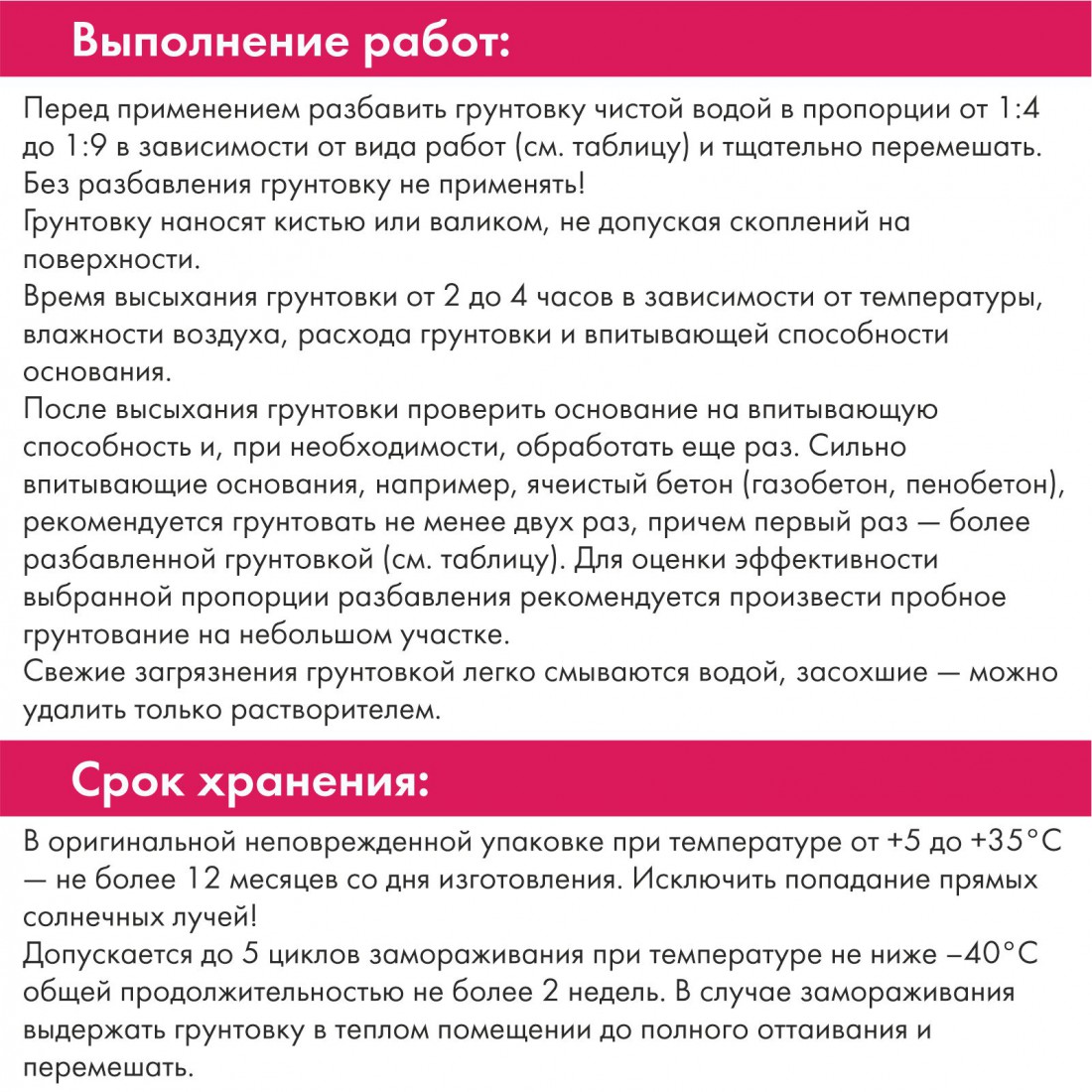 Допускается до 5 циклов замораживания при температуре не ниже –40°C общей продолжительностью не более 2 недель. В случае замораживания выдержать грунтовку в теплом помещении до полного оттаивания и перемешать.
