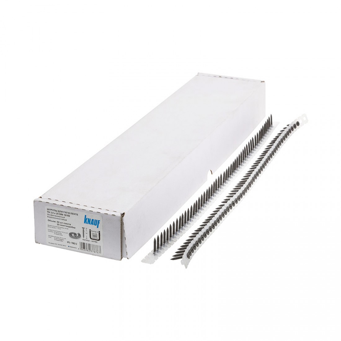 Саморез в ленте для гипсокартона Knauf TN острый 3,5х25 мм металл-гипсокартон самонарезающий, 1000 шт/упак купить в Новом Уренгое по оптовой цене в интернет магазине СтройПлатформа. Крепежный элемент с мелкой резьбой, потайной головкой, крестообразным шлицем и острым наконечником выполнен из стали с антикоррозионным фосфатированным покрытием.