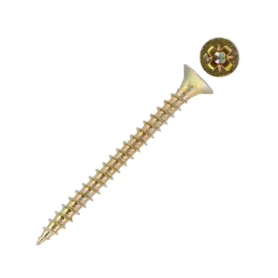 Саморез универсальный 6х100 мм оцинкованный желтый, кг купить в Новом Уренгое по оптовой цене в интернет магазине СтройПлатформа. Универсальный крепежный элемент с крупной резьбой, потайной головкой, крестообразным шлицем и острым наконечником выполнен из стали с оцинкованным желтым покрытием.