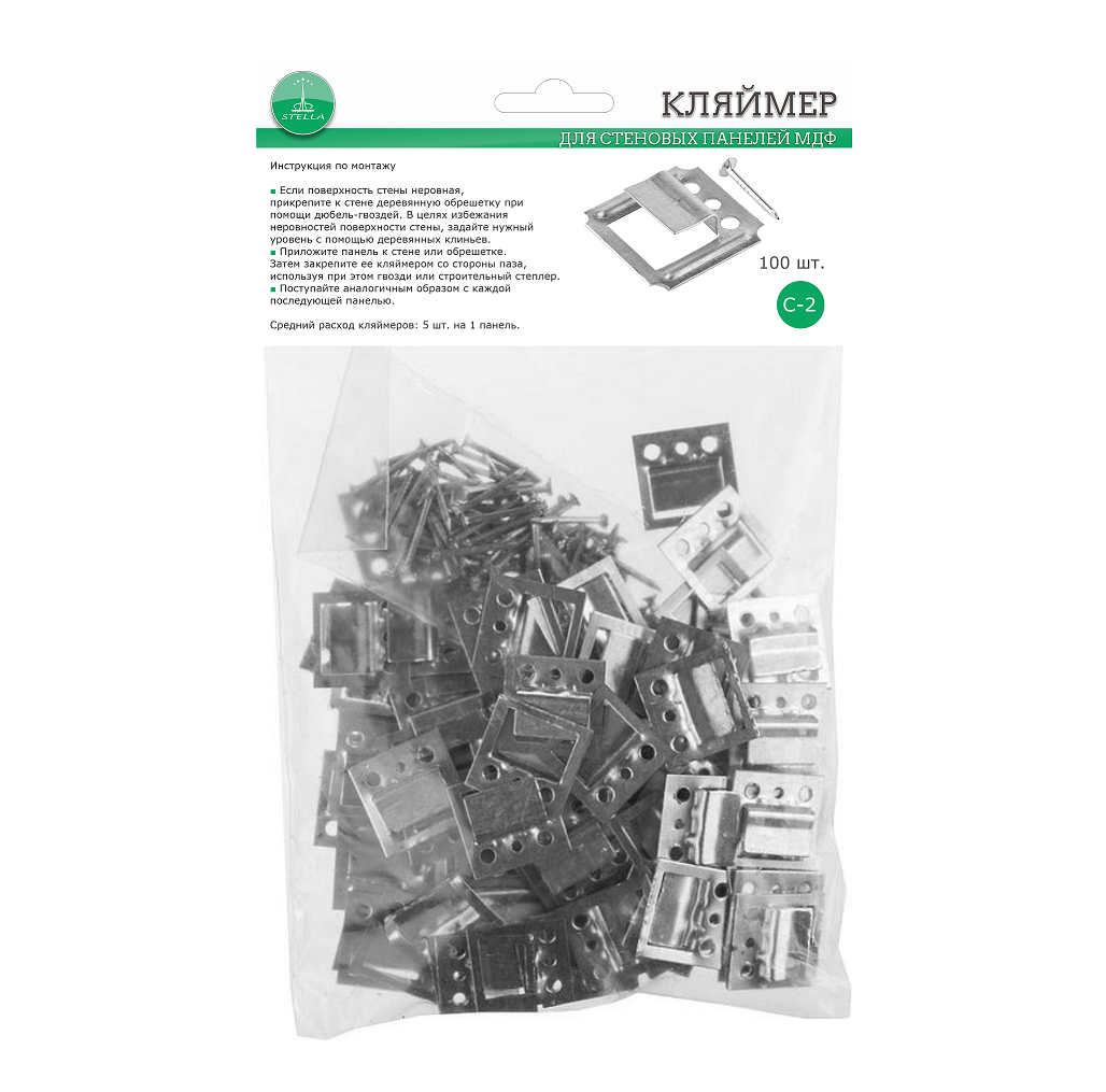 Кляймер Stella для МДФ панелей 20х22х2 мм, 100 шт/упак купить в Новом Уренгое по оптовой цене в интернет магазине СтройПлатформа. Кляймер - это металлическая перфорированная пластина (клипса) для крепления стеновых панелей МДФ. Кляймер маркируют номером С-2, который отражает расстояние язычка кляймера от его основания. Кляймеры крепятся язычком на заднюю стенку паза панели МДФ. Затем через отверстия фиксируются к бруску гвоздями.