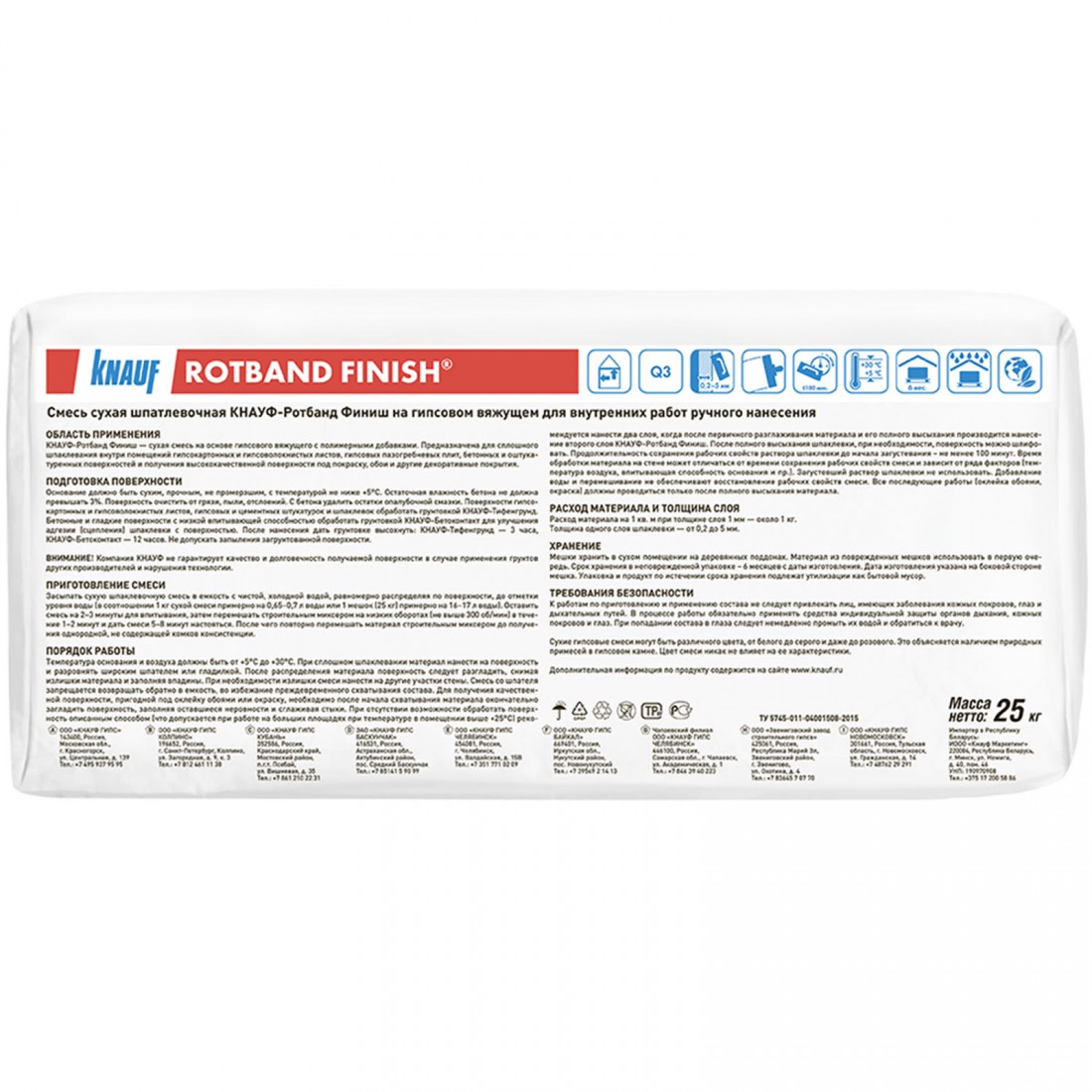 Шпаклевка гипсовая Knauf Ротбанд-Финиш финишная, слой 0,2-5 мм, 25 кг, шт купить в Новом Уренгое по оптовой цене в интернет магазине СтройПлатформа. Knauf Ротбанд-Финиш - сухая шпаклевочная смесь на основе гипса и полимерных добавок предназначена для финишного выравнивания поверхностей внутри помещений. Образует гладкое покрытие, готовое под покраску, оклейку обоями или нанесение декоративных покрытий.