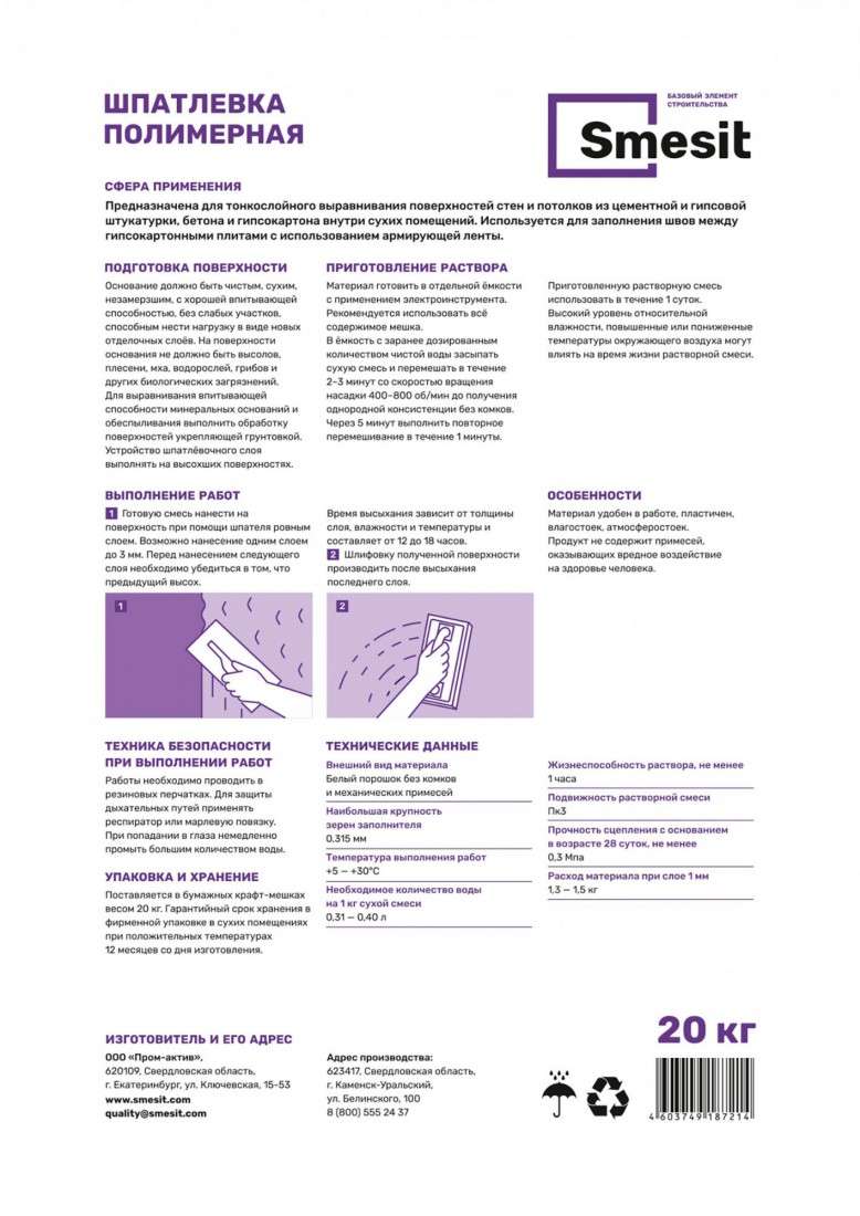 Шпаклевка полимерная Smesit белоснежная 20 кг, 56 шт/поддон купить в Новом Уренгое по оптовой цене в интернет магазине СтройПлатформа. Шпатлёвка Smesit полимерная предназначена для тонкослойного выравнивания стен и потолков из цементной и гипсовой штукатурки, бетона и гипсокартона в сухих помещениях. Продукт также используется для заполнения швов между гипсокартонными плитами с применением армирующей ленты.