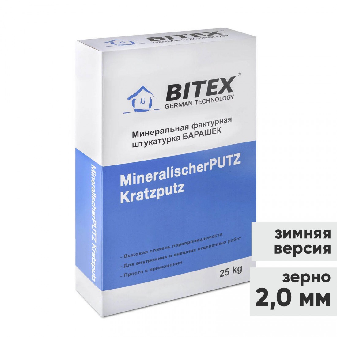 Штукатурка декоративная Bitex MineralischerPutz Kratzputz Winter ЗИМА Барашек зерно 2,0 мм, белая, 25 кг, шт купить в Новом Уренгое по оптовой цене в интернет магазине СтройПлатформа. Белая минеральная штукатурка с равномерно-шероховатой структурой "барашек" предназначена для декоративной отделки фасадов и внутренних стен. В состав входят известь, белый цемент и мраморная крошка, что обеспечивает высокую прочность и долговечность покрытия. Продукт идеально сочетается с системами утепления, особенно при использовании минеральной ваты в качестве теплоизоляции, а также подходит для декоративной отделки стен без утепления.
