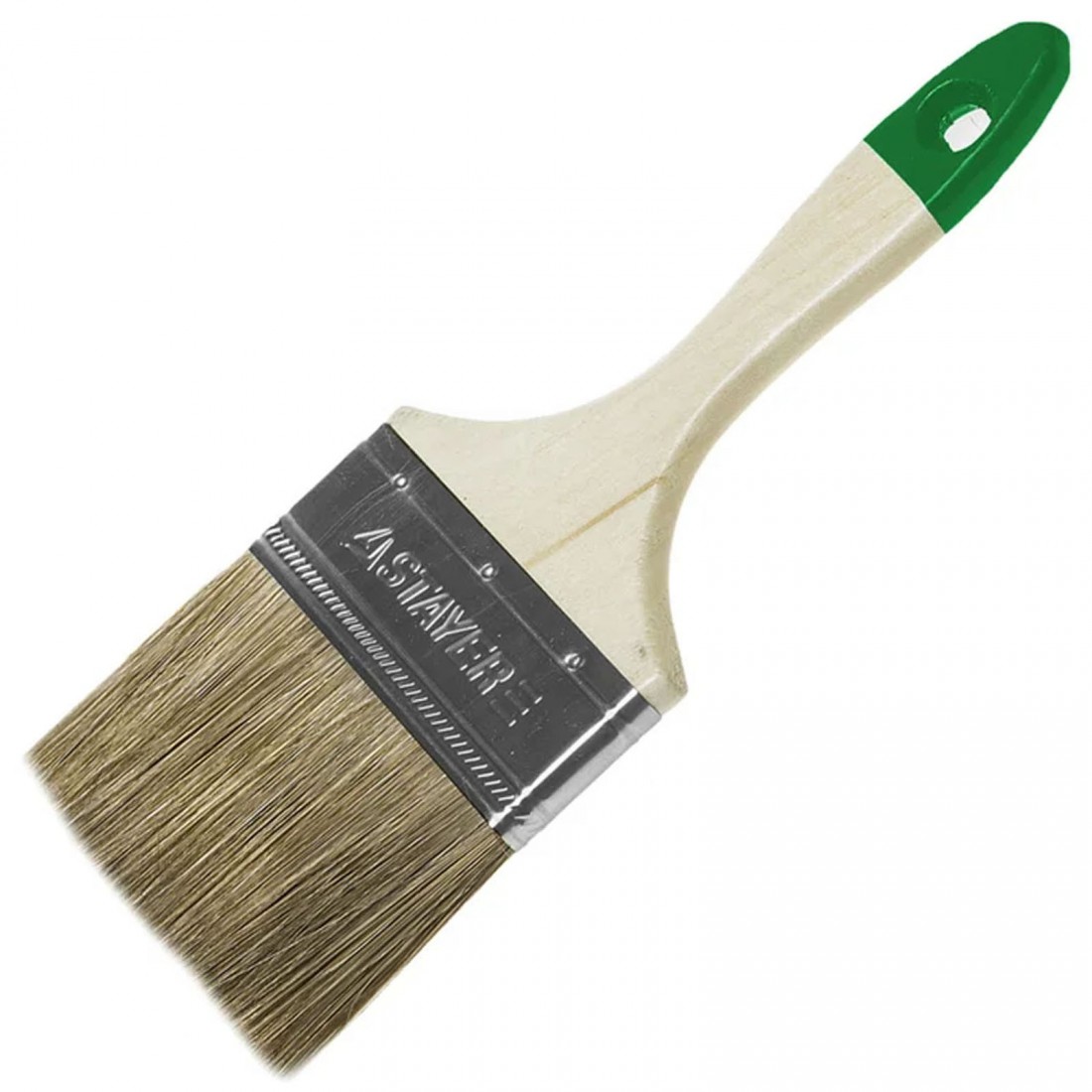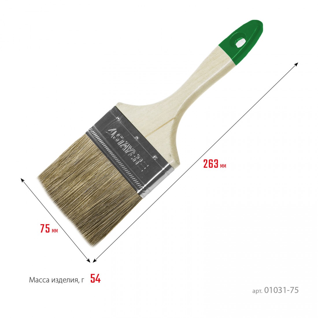 Щетина кисти надежно закреплена стальным бандажом, что увеличивает её долговечность и предотвращает потерю формы во время работы. Удобная деревянная рукоятка обеспечивает комфортный захват и позволяет работать длительное время без усталости.