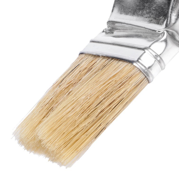 Щетина надежно закреплена с помощью клея на эпоксидной основе и деревянных клиньев, что обеспечивает долговечность инструмента. Бандаж из жести защищает кисть от деформации, сохраняя её форму в процессе работы. Отшлифованная деревянная рукоятка без покрытия обеспечивает удобный и надежный захват, делая работу более комфортной.