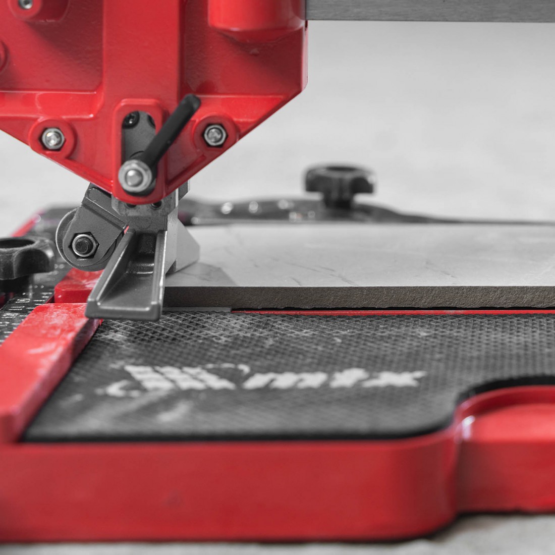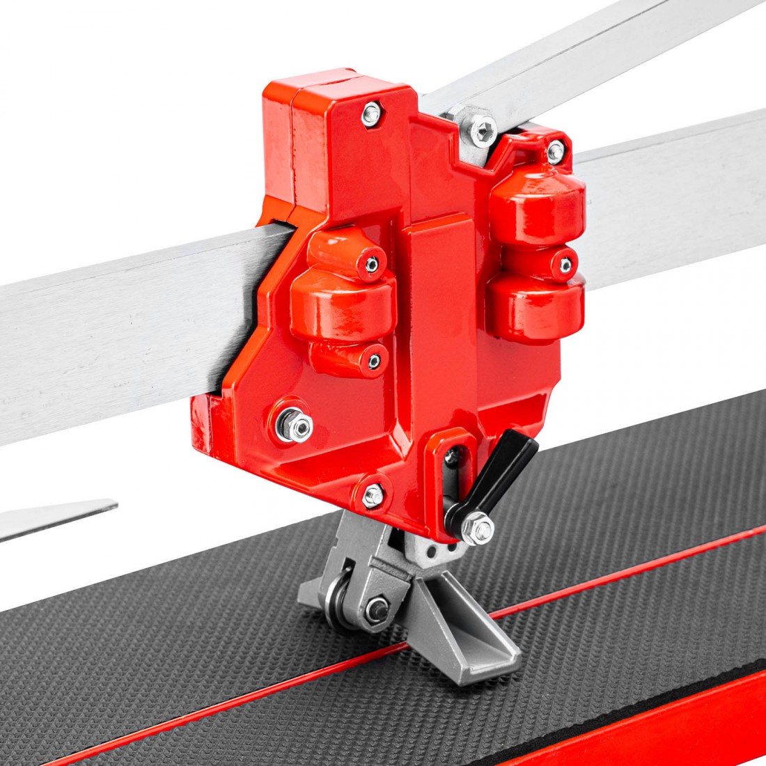 Плиткорез предназначен для точной резки плитки длиной до 600 мм и толщиной до 14 мм. Оснащён усиленным стальным монорельсом и литой станиной из магниевого сплава, что обеспечивает прочность и устойчивость конструкции. Ходовая каретка с 9 подшипниками (4 из них регулируемые) перемещается плавно и без люфтов, обеспечивая чистый и точный рез.