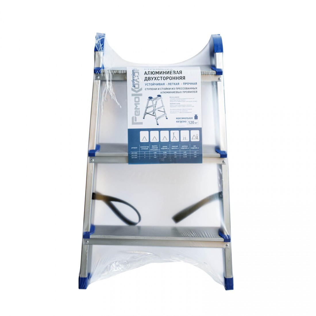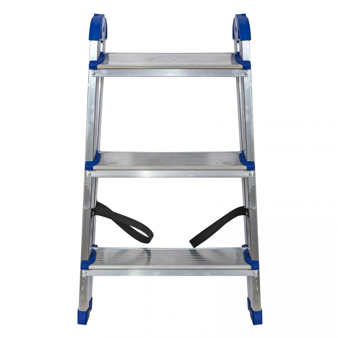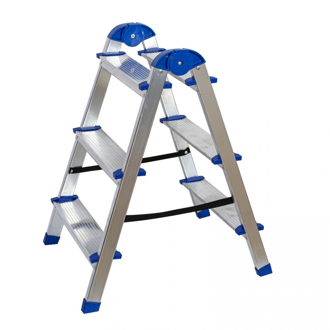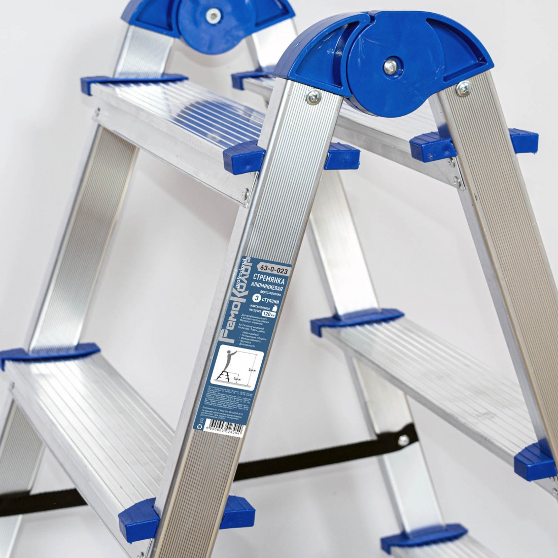 Стремянка алюминиевая двухсторонняя, 3 ступени, шт купить в Новом Уренгое по оптовой цене в интернет магазине СтройПлатформа. Стремянка алюминиевая двухсторонняя РемоКолор Professional, 3 ступени - Надежная трехступенчатая стремянка предназначена для комфортного выполнения работ на высоте. Двухсторонняя конструкция позволяет работать с обеих сторон, а увеличенная высота площадки (0,6 м) и рабочая высота (2,6 м) обеспечивают больший простор для маневров по сравнению с двухступенчатыми моделями. При этом стремянка сохраняет компактность и небольшой вес (2,5 кг), что делает ее удобной для переноски и хранения.