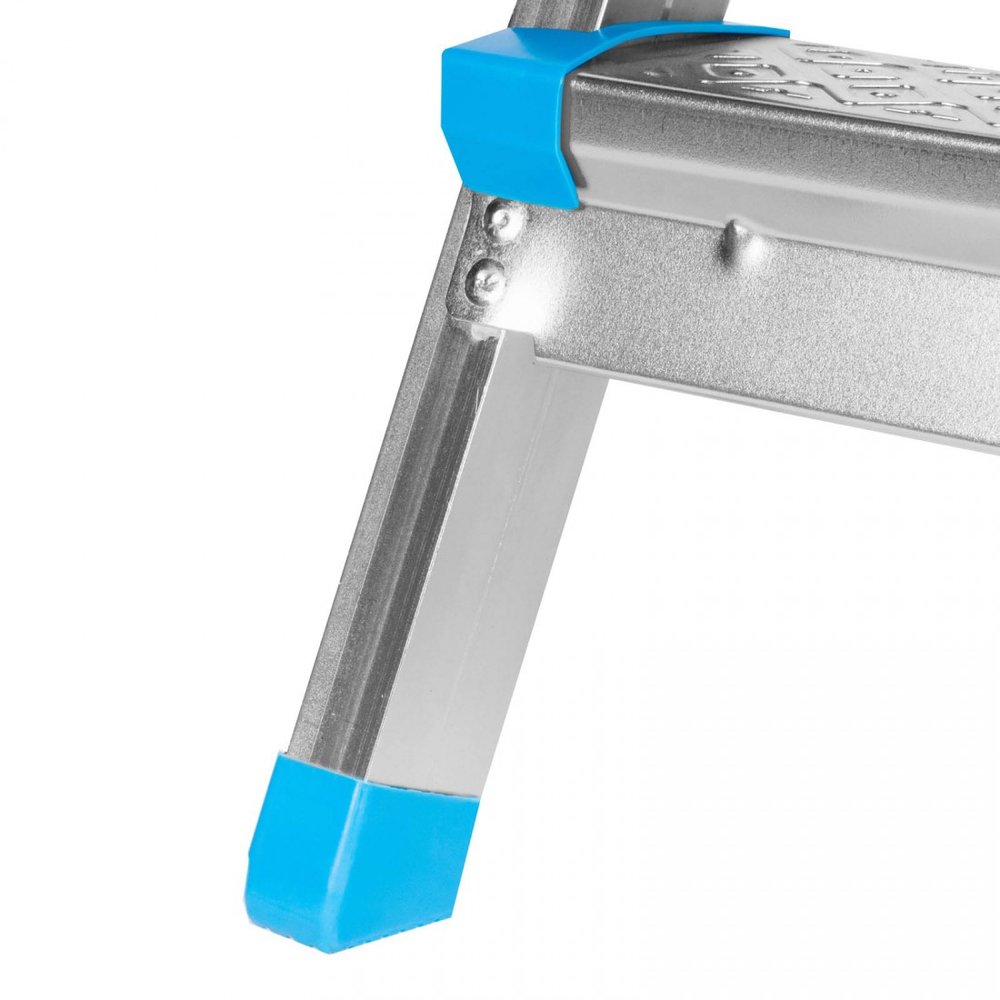 Компактные габариты в сложенном виде (0.1м x 0.44м x 1.32м) позволяют хранить стремянку в ограниченном пространстве. Увеличенная высота площадки 0,77 м обеспечивает удобство при выполнении продолжительных работ. Односторонняя конструкция оптимизирована для использования в узких проходах и помещениях с ограниченной площадью.