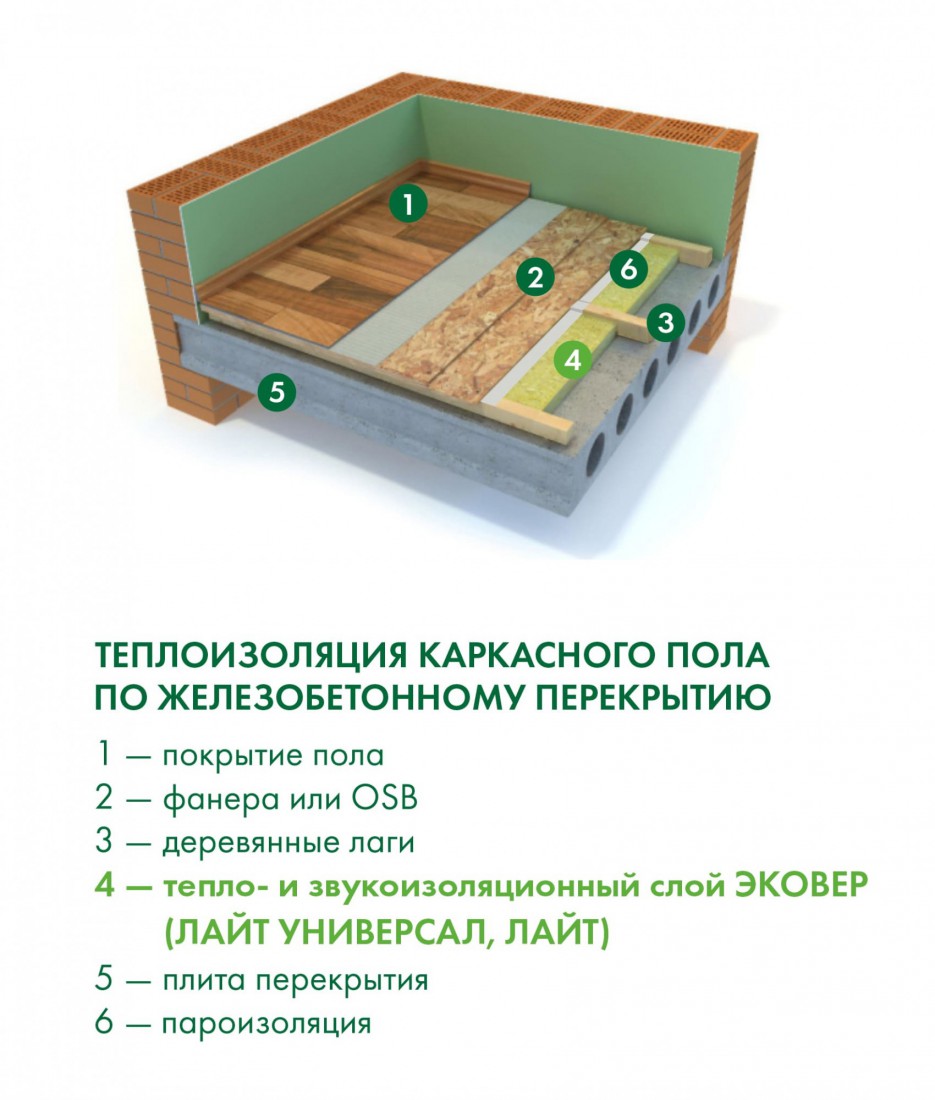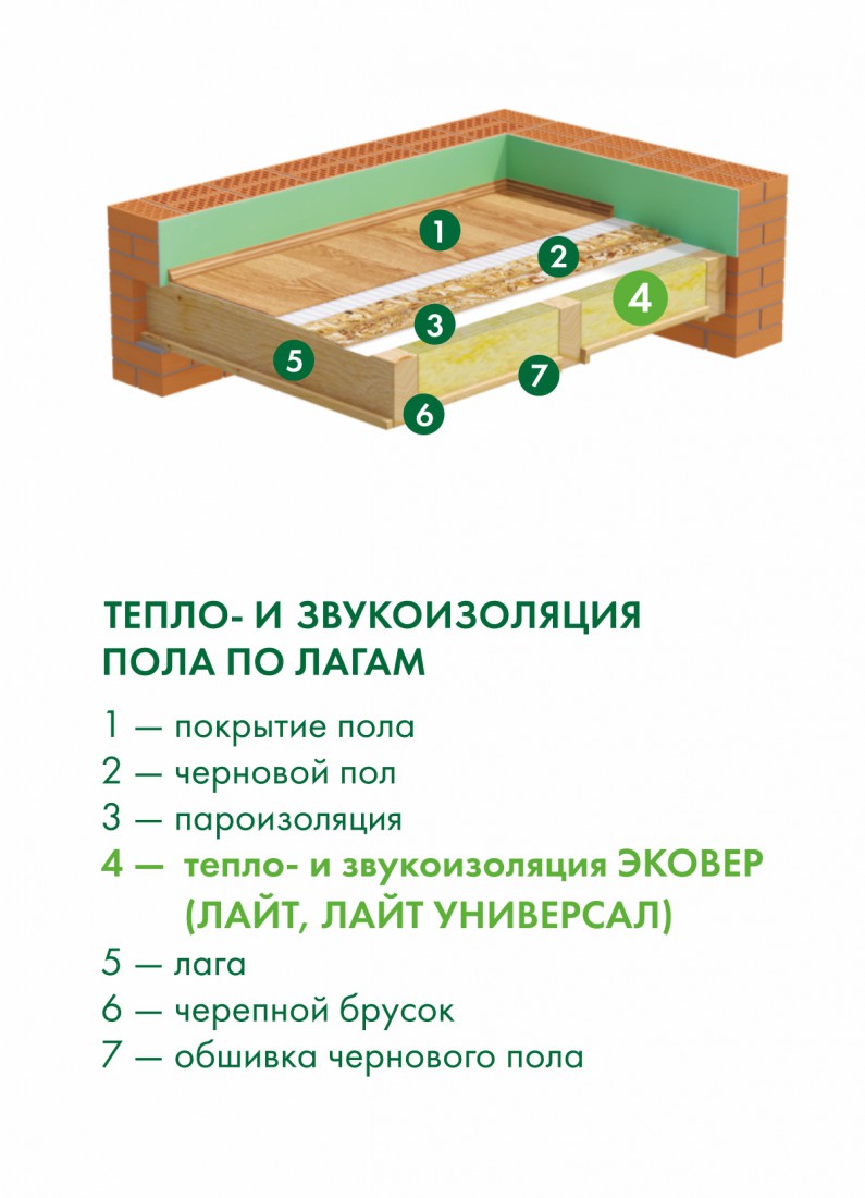 - Полах с покрытием всех типов по несущим лагам с укладкой утеплителя между лагами;